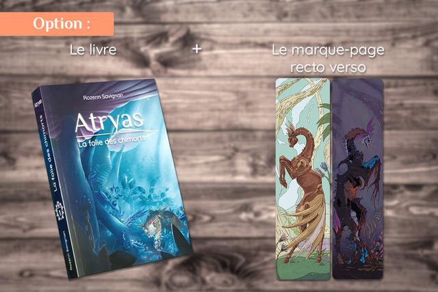 2. Livre + marque page : tu recevras le livre "Atryas - La folie des chimorts" et le marque-page "filvent/chimort" recto verso (visible sur la boutique).
